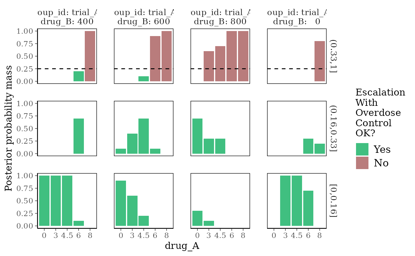 interval_probvector a maximal admissible probability mass for a given dose level. Whenever the posterior probability mass in a given interval exceeds the threshold, then the Escalation With Overdose Control (EWOC) criterion is considered to be not fulfilled. Dose levels not fulfilling EWOC are ineligible for the next cohort of patients. The default restricts the overdose probability to less than 0.25. Forblrm_trialmethods, this is taken fromsummary(blrm_trial, "interval_max_mass")by default.- ewoc_colors